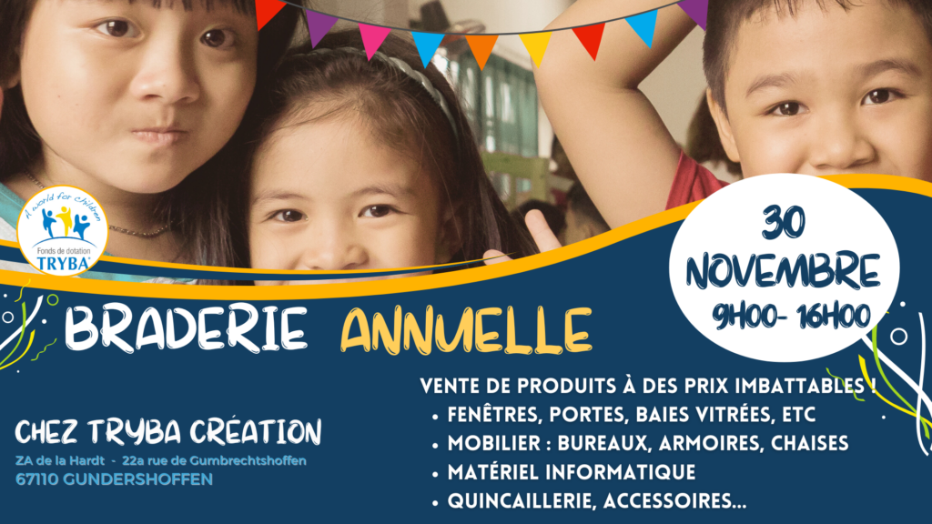 Cette braderie est organisée par les sociétés et les collaborateurs du groupe ATRYA. Le produit de la vente a été intégralement reversé au fonds de dotation TRYBA – A World for Children afin de soutenir les enfants défavorisés à travers les ONG que nous soutenons,